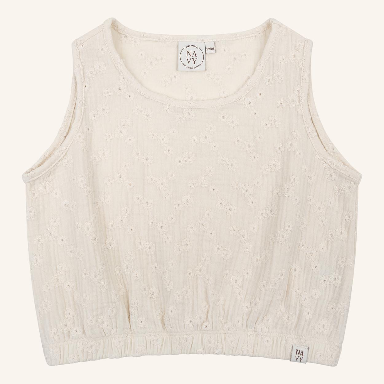 Das Pippa-Oberteil ist aus leichtem Broderie-Stoff in Weiß mit einem raffinierten Herzmuster gefertigt. Bequem, luftig und perfekt für Sommertage.